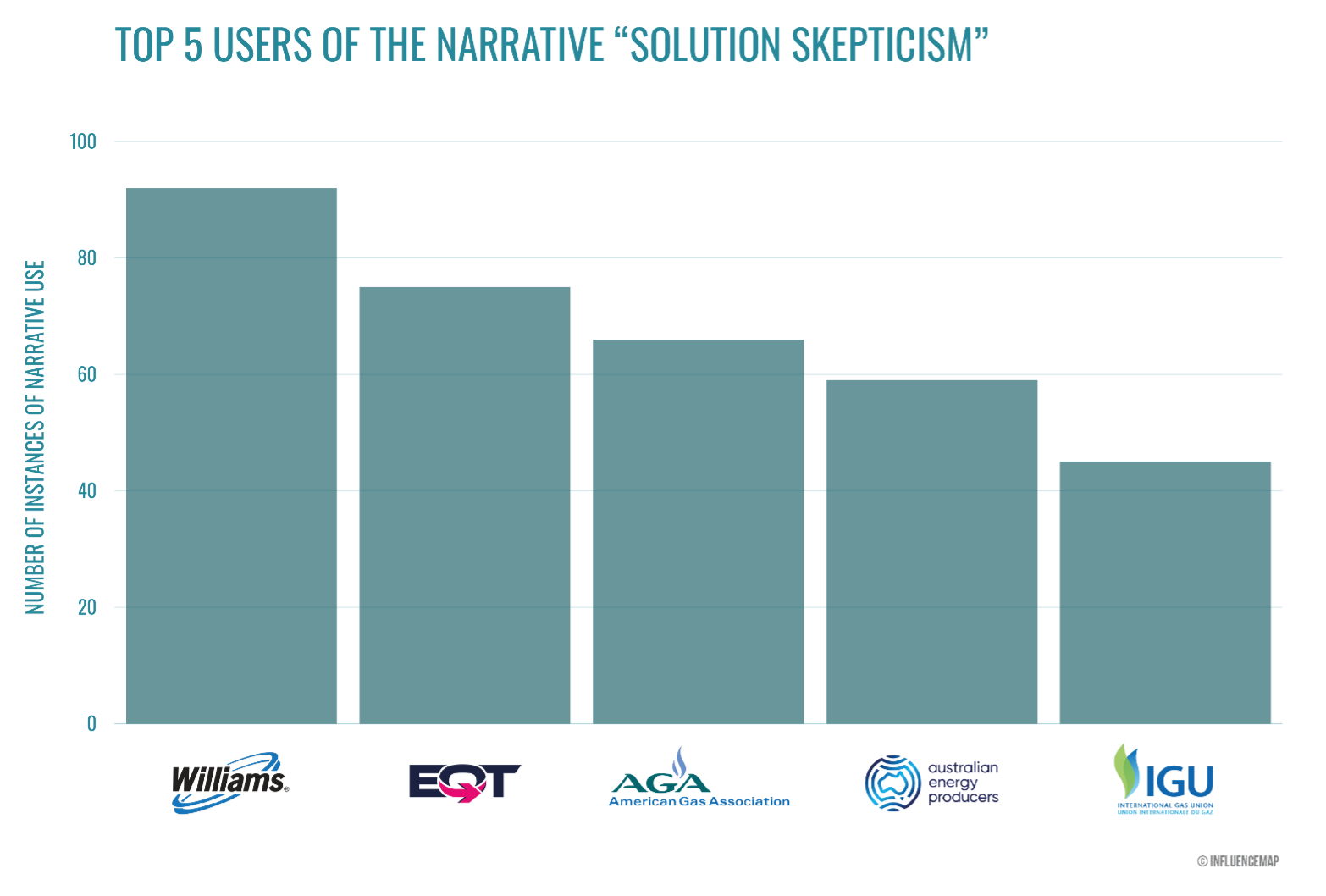 "Solution Skepticism" aims to downplay alternative energy sources or amplify the perceived challenges of transitioning away from fossil fuels. It includes arguments that portray fossil fuels—especially gas—as “clean” or “low carbon” or that emphasize greenhouse gas (GHG) emissions from renewable energy alternatives. The narrative also includes claims that cast doubt on the viability of a renewable-dominated energy system, that understate the level of support needed for such a transition, or that support future technological innovations over immediate emissions reductions.