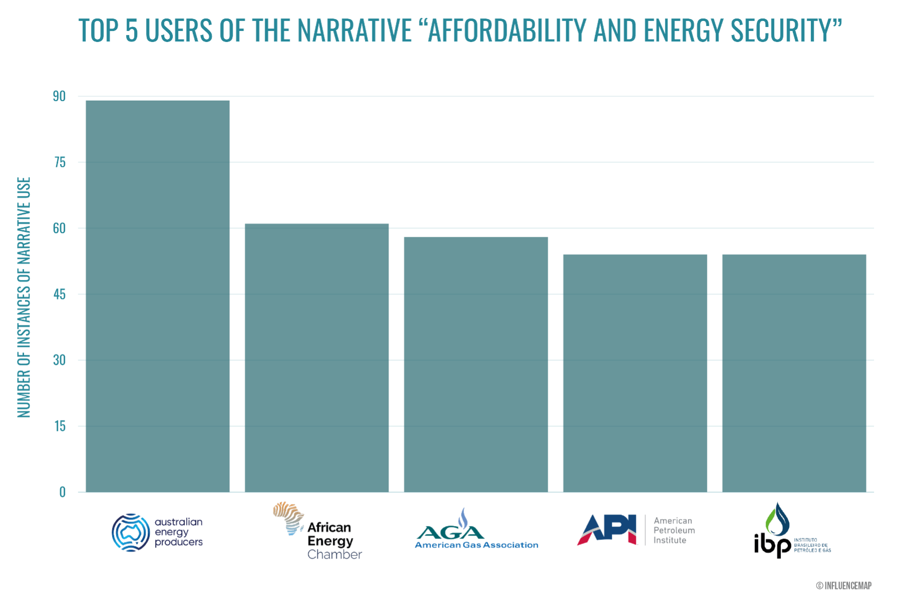 This narrative has 1028 recorded uses since COP28, with entities including Australian Energy Producers, African Energy Chamber, American Gas Association, American Petroleum Institute, and Instituto Brasileiro de Petróleo e Gás (IBP) using the narrative most frequently.